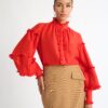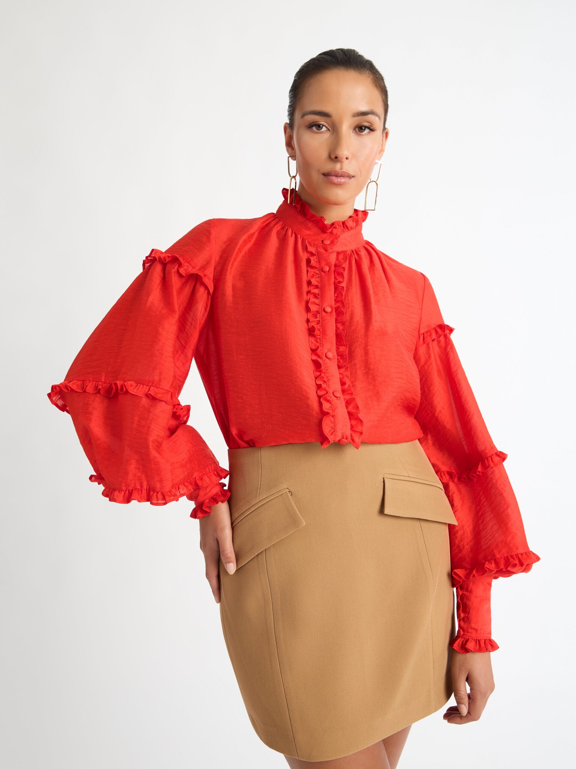 Demand their attention in decadent red. Introducing the Highfield Blouse – showcasing a relaxed fit, balloon sleeves, ruffle detailing and front placket button closure. Pair with our Bethany Skirt and Tori Earrings to complete the look.?