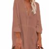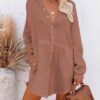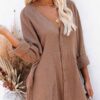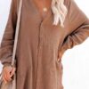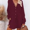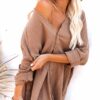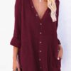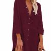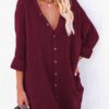 V neckline, button front, long sleeve, solid color, loose fit shirt dress