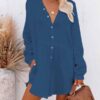V neckline, button front, long sleeve, solid color, loose fit shirt dress