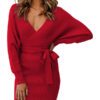 Sexy v neck sweater dress, long sleeve tie waist mini pencil dress