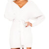 Deep V-neck, batwing long sleeve, front mock wrap, pullover style, mini short length, removable bowknot belt, solid color, backless, slim body, mini sweater dress.