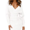 Women’s Sexy Cocktail Dress V Neck Long Sleeve Wrap Knit Sweater Mini Dress