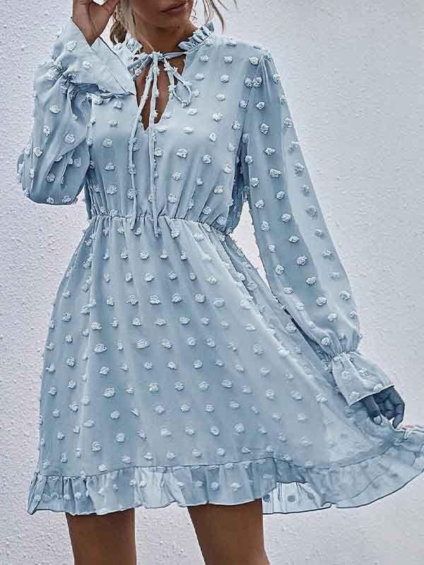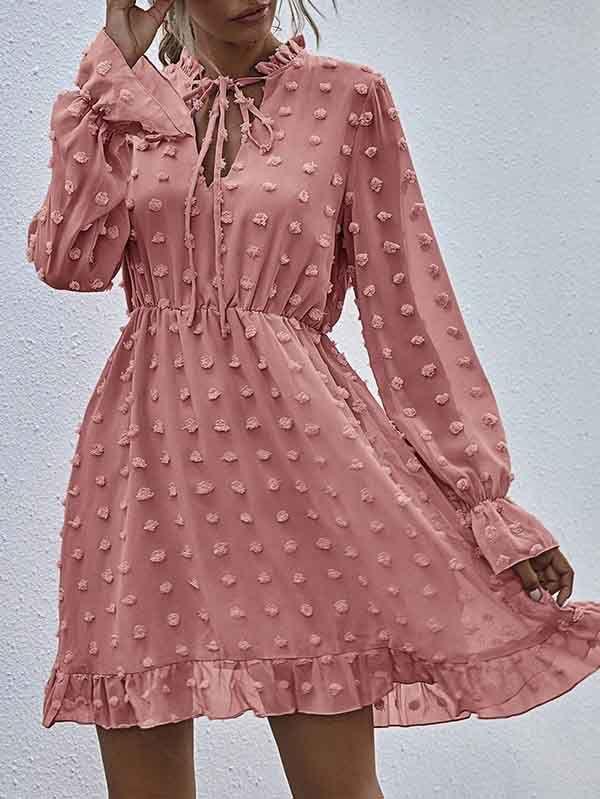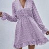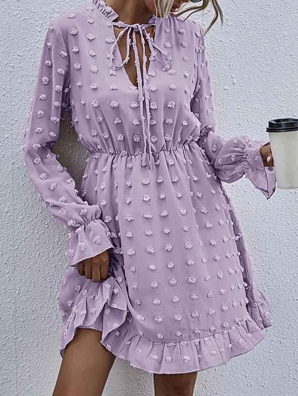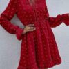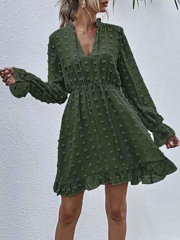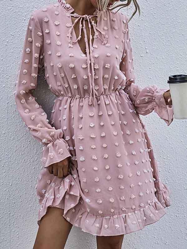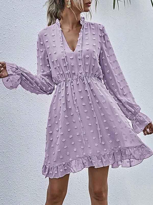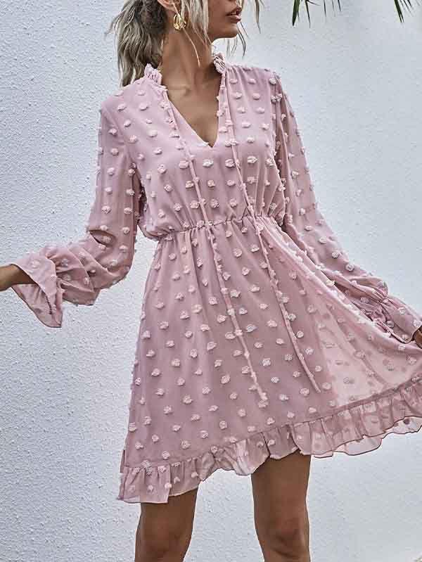 - V neckline flowy dress with long sleeves, swiss dot throughout, ruffle detail at hemline