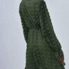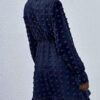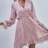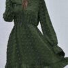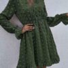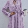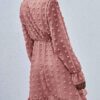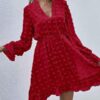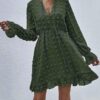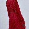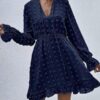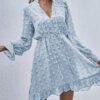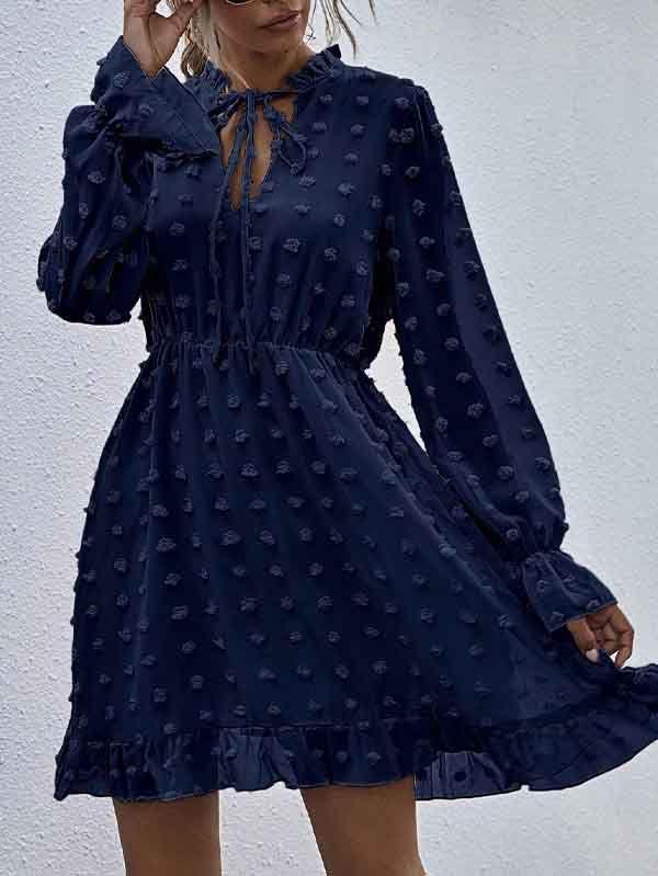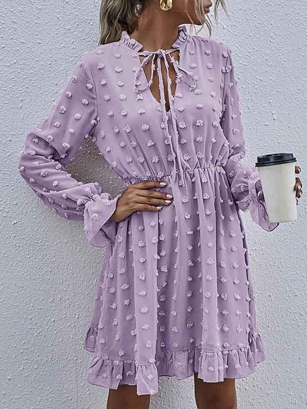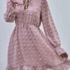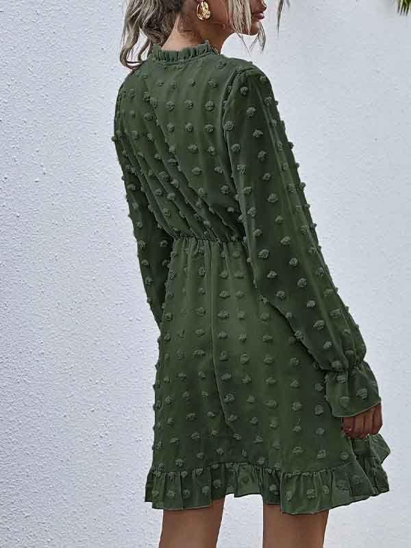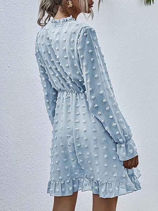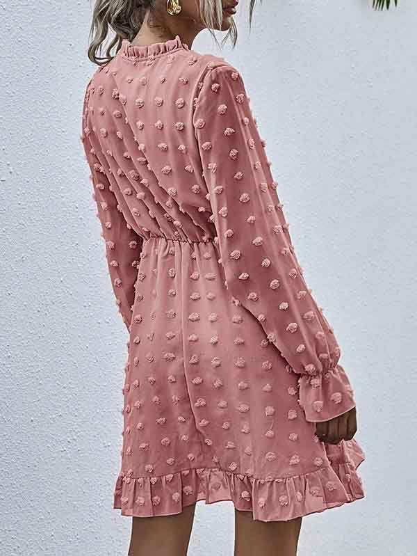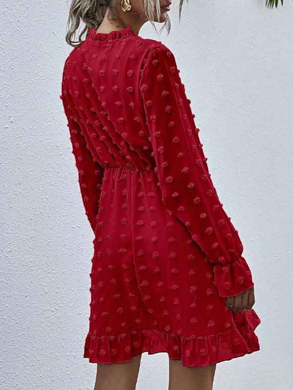 - V neckline flowy dress with long sleeves, swiss dot throughout, ruffle detail at hemline