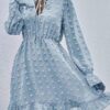 - V neckline flowy dress with long sleeves, swiss dot throughout, ruffle detail at hemline